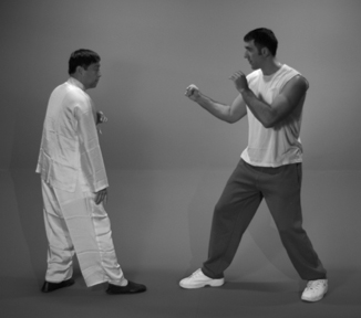 The hard and heavy skills can cause serious injury to the opponent. Application of these skills usually requires proper distancing relative to the opponent. When this is done it allows the force to be released in the most efficient manner. The first concern has to do with the target (e.g., head, stomach, ribs, groin, joints, acupuncture points), and the second is a mental aspect .The mind envisions the total and absolute destruction of the target. The hard and heavy skills represent lethal finishing moves in many cases. Throughout the early history of Tongbei, masters were known to use certain skills to kill opponents. For example, the "Planting Punch" (Zai Chui) is a downward punch to the stomach or ribs that is used only when very close in with the opponent. The secret here is the generation of whole body force, which starts from the foot, and goes through the legs, back, shoulder, arms and into your fist. Move your whole body downward as you imagine punching a deep hole into the ground. The main problem with this type of skill is the inability to change once committed, and so its use is limited only to a few situations.